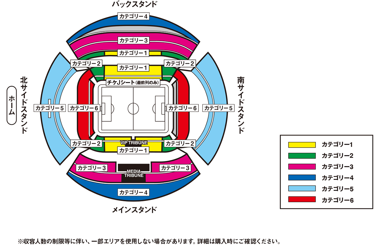 座席とピッチとの間に手すり、フォトグラファー、広告看板、テレビカメラがあるため、タッチライン際が見えませんので、あらかじめご了承ください。なお、見えない範囲は座席位置によって異なります。