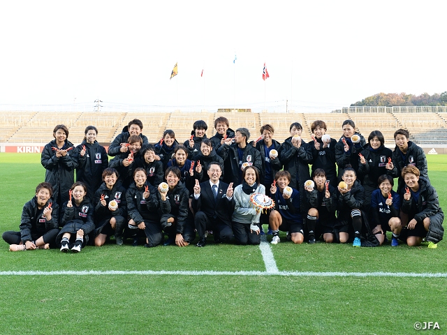 練習後には鳥取県の平井伸治知事から「ぜひ明日は素晴らしいプレーで、鳥取でいい思い出を残してください」と激励を受け、鳥取県名産の梨などを寄贈いただきました。そして最後には「明日はいい試合になりますように、祈るウェー(いノルウェー)」と、平井知事のユーモアあふれる励ましに、なでしこジャパンの選手・スタッフ一同は、一層和やかなムードに包まれました。