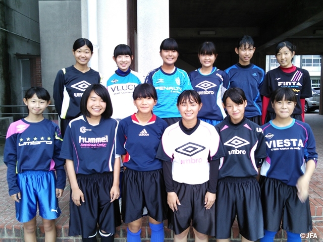 熊本県女子サッカーの部活動として草分け的な存在です。創部まもなく休部したものの、復活後、20年も活動を続けています。現在、3年生12名、2年生7名、1年生11名の合計30名の部員がいます。ボールフィーリングにこだわって練習を重ねています。今回は全国の仲間と共に、トレーニング、ゲームを重ねながら、「動きながらのプレー」、「タイミング」等についてしっかり学び、今後のプレーに生かしていくつもりです。交流をしっかり深め、中学生活の良き思い出を創ります。