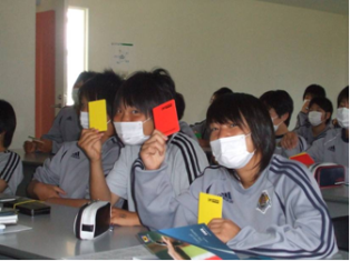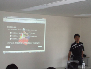 今回の講習会では、Jリーグ・Lリーグの映像を用いたクイズ形式の問題と筆記テストが行わ