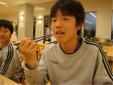 ホームステイ先でもらったさやえんどうをほおばる選手達