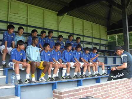 試合前にミーティングを行い、自分達の長所である運動量や、連動したプレーで動きながら