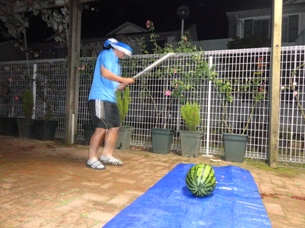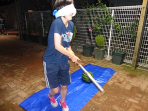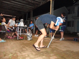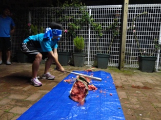 食後は厨房から頂いたスイカでスイカ割りをしました。