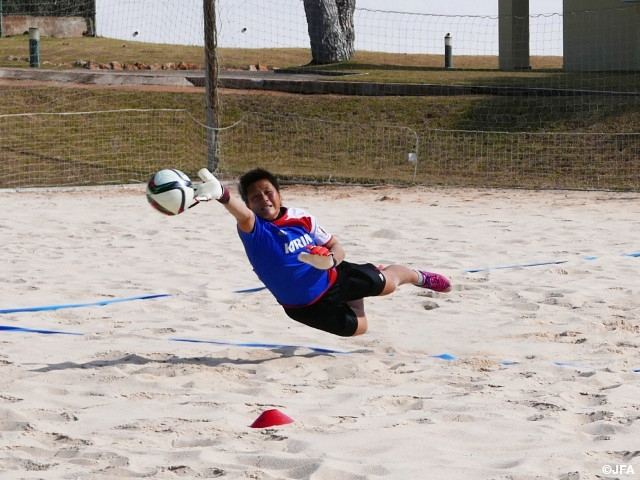 翌28日は午前中から約2時間のトレーニング。ウォーミングアップはフィールドプレーヤーとGKに分かれて行い、GKはビーチサッカーのピッチ上でキャッチなどを繰り返し、フィジカルを鍛えました。その後の全体練習ではゲーム形式を中心に、最後は紅白戦で締めくくりました。