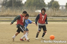 この日のトレーニングは朝10時~12時までの2時間。学年ごとに分かれてリフティングやパス回しなどでウォーミングアップを行ったあと、チームに分かれてミニゲームを行いました。「1年生はまず基本技術ですね。その後、1人で守る、1人で攻めるといった動きを身につけます。その上でマークの原則を理解させていくようにしています。後は人数を増やして、スペースを広げていく。これを1年かけて行います。2年生になると、今度は“2人で崩す”。その人数を増やしていく。攻撃も同じです。3年生はこれまでやってきたことを踏まえて、チームとして、また個人として質を上げていくことになります」と語るのは、その時々でテーマを変えながらメニューを考えているという宮内一監督。宮内監督は時折プレーを中断し、選手たちに問いかけ、選手自身に考えさせながらプレーを導き出していきます。