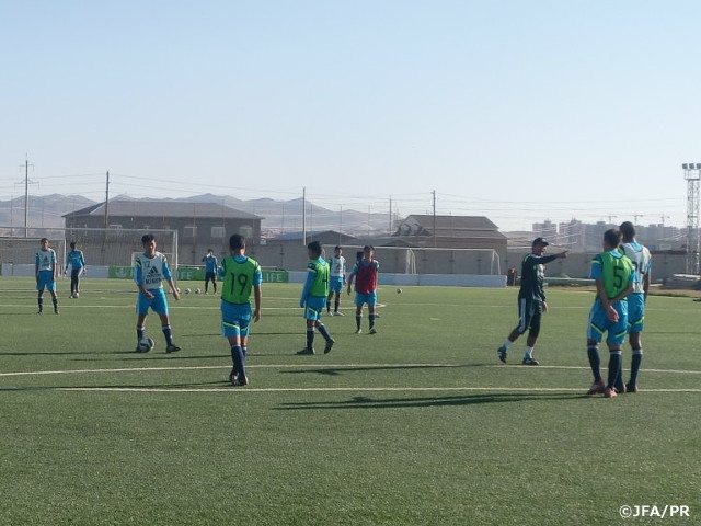 モンゴル到着翌日、早速2部練習を実施しました。午前中は試合会場となるMFF Football Centerでトレーニングをしました。人工芝ピッチの状況、広さ、更衣室の様子など、選手は本番を想定して雰囲気を感じていきます。菅平キャンプ同様ハートレートモニター(心拍計)を使用して脈拍を測り、自らのコンディションを確認するトレーニングから開始しました。初めて経験するモンゴルの高地で多少息が上がる選手もいましたが、チームの雰囲気も継続的に良く、選手は精力的に汗を流します。午後は会場を移してトレーニングをした「00JAPAN」は攻撃を意識した練習に時間を割きます。3人でのパス回しからスタート。足元に正確に合わせるパスの精度を高めるトレーニングから行いました。その後はハーフコートでGKを入れて3対2や4対3など、ゴール前での崩しをいかにするか、攻撃のアイデアを増やし連携を深めていきます。最後には10対10の紅白戦を行い、モンゴル初日のトレーニングは終了しました。