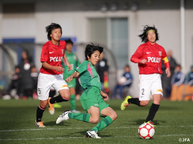 もう一方のブロックでは第17回大会の準優勝チーム・浦和レッドダイヤモンズレディースユース(関東2/埼玉)が力強さを披露します。GKの清水栞選手やDF南萌華選手を中心に粘り強く守り、決勝まで無失点を維持。準決勝では高橋はな選手が前半に挙げた1点を守り切り、ジェフユナイテッド市原・千葉レディースU-18(関東3/千葉)との接戦をものにしました。