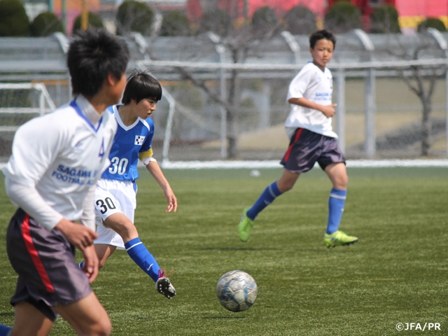 今回のJFAエリートプログラム女子U-14のトレーニングキャンプは3月28日(月)、あっという間に最終日を迎えました。この日は狩野倫久ナショナルトレセンコーチが指導しているSAGAWA SHIGA FC Jr Youthとの練習試合を行いました。相手はU-14とU-15の選手が所属し、体格やスピードが勝る相手との対戦となりましたが、全員がこの4日間の活動の集大成にしようという姿勢が観られた試合となりました。