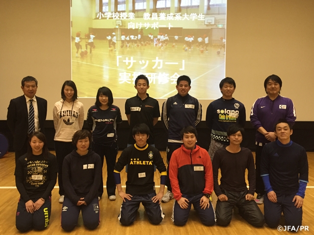 小学校の教員を目指す大学生を対象とした「小学校体育サポート研修」を24日(木)、JFAハウスで開催しました。小学校体育サポート研修会は、体育やサッカーの授業を苦手とする先生をサポートするために2014年から実施しているもので、インストラクターの資格を持つJFAの指導者養成ダイレクターや地域ユースダイレクターが指導にあたっています。
