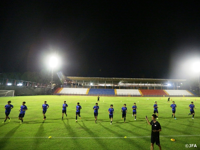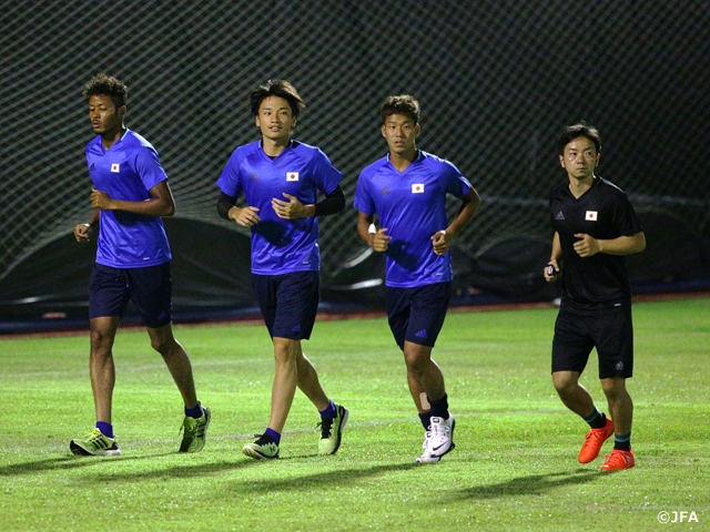夜遅い試合のキックオフ時間に合わせて、これまでよりも遅い19時すぎから始めた練習には、日本から駆けつけたFW鈴木武蔵選手、MF野津田岳人選手(いずれもアルビレックス新潟)、DF中谷進之介選手(柏レイソル)のバックアップメンバー3人がチームに合流。ランニングとストレッチなどの別メニューで調整を図りました。