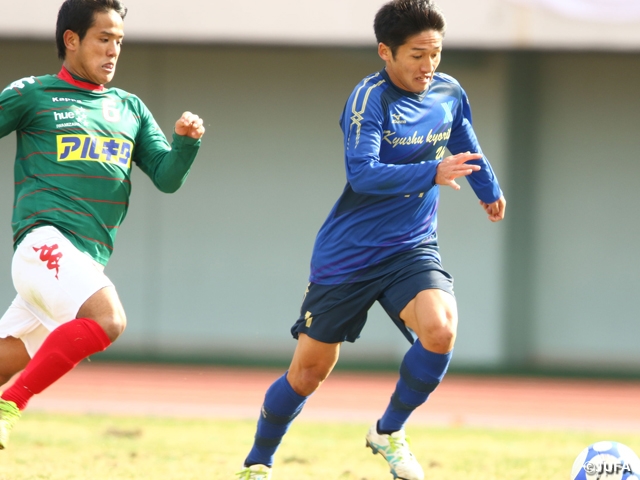 北海道第1代表の北海道教育大学岩見沢校は、初出場の九州第3代表、九州共立大学と対戦しました。前半8分、九州共立大学が、ボランチ・角康平選手の前線への鋭い飛び出しからゴールを挙げます。早い時間帯に決めた先制点を守りきった九州共立大が、インカレ初勝利を挙げました。