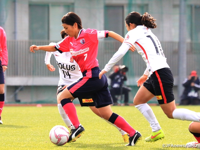 連覇を狙うC大阪と昨年3位の浦和の決勝は、C大阪が序盤から攻撃的な姿勢を見せます。一方の浦和も相手のプレスをかいくぐってサイド攻撃につなげ、際どい場面をつくるなど、互いにゴールに迫ります。スコアが動いたのは23分、C大阪が林穂之香選手のFKから、こぼれ球を野島咲良選手が決めて1-0とします。これで勢いに乗ったC大阪は30分、右CKのチャンスに宝田沙織選手が競り勝ち、ヘディングで追加点を挙げます。その後もダイナミックなプレーでゴール前へとボールを運ぶC大阪に、浦和ディフェンスも必死に応戦し、試合はC大阪が2点をリードして前半を折り返しました。