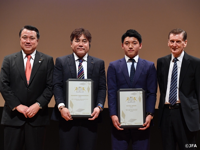 開会に先立ち、昨年12月に行われたAFCアニュアルアワード2016でU-23日本代表監督として特別レコグニション賞を受賞した手倉森誠SAMURAI BLUEコーチと年間最優秀ユースプレイヤーを受賞した堂安律選手(ガンバ大阪)が今回来日しているアジアサッカー連盟(AFC)のアンディ・ロクスブルグ氏より改めて表彰され、参加した指導者の方々から大きな拍手をもって称えられました。