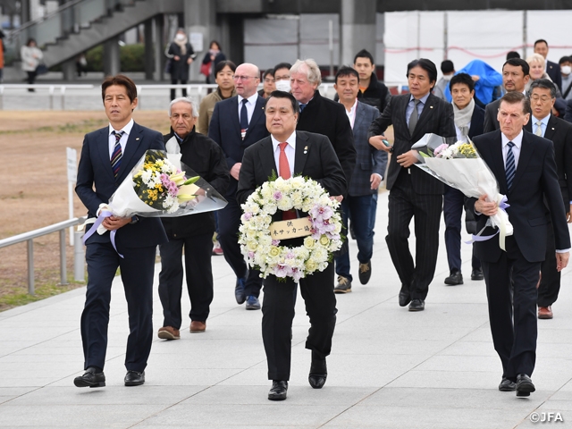 本日はカンファレンスの開会を前に田嶋JFA会長以下、西野技術委員長、山本技術副委員長らが、海外のゲストと一緒に平和記念公園を訪ね、慰霊の意を込め、献花を行いました。サッカーのみならず、サッカーを通して、日本を知っていただき、お互いの文化、価値観にふれ合うことができるのもサッカーの持つ大きな力であることを実感することができました。