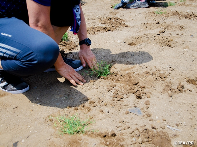 2008年にスタートした、JFAによるポット苗の提供は、今回で11年目となり、本年度は33の団体に向けおよそ60万株をJFAが提供。全国各地でグラウンドや園庭への植え付け作業を実施しています。