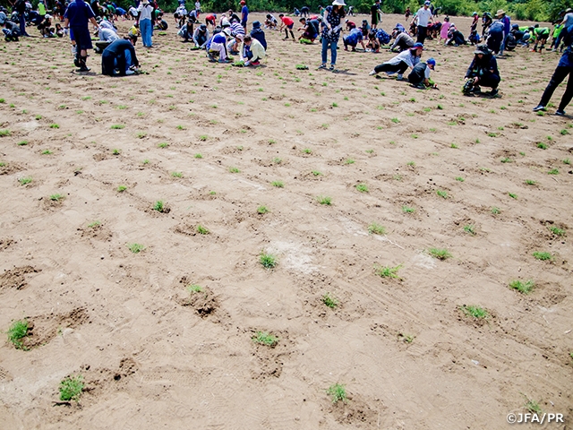 グラウンド一面に広がる芝生を、小さな苗の植え付けから実現する、JFAグリーンプロジェクト「ポット苗方式芝生化モデル事業」は、この6月前後に苗の植え付けシーズンをむかえます。