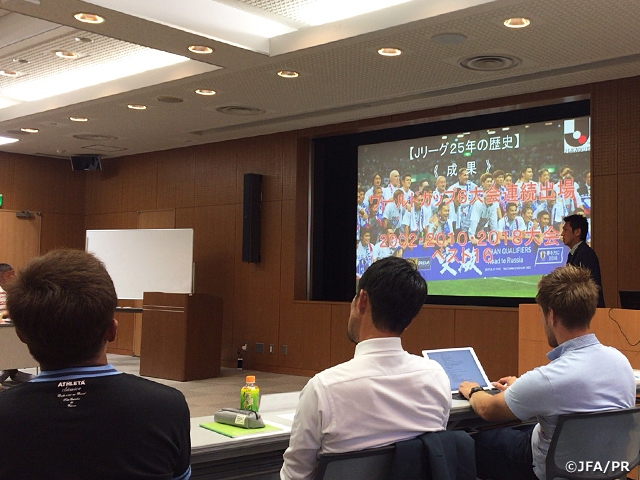 9月19日(水)には、サッカージャーナリストの大住良之さんに「マスメディアと監督」について、講義していただきました。サッカージャーナリストとして、これまで日本サッカーの様々なシーンに立ち会われ、ご自身もサッカー指導者である大住さんならではの豊富な現場経験に基づいたお話でした。監督として、メディアとどのように関わっていくべきかについて、エピソードを交えて、多くのアドバイスをいただきました。