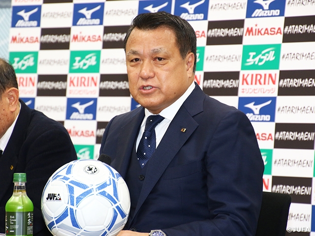 田嶋会長は主催者代表挨拶の中で2018FIFAワールドカップ ロシアの日本代表(SAMURAI BLUE)のメンバーや現在の代表チームにも多くの大学サッカー出身選手が活躍していることに触れ、「大学サッカーは将来の日本のサッカーを背負う選手たち、企業人を育成する大切な場」であると述べました。田嶋会長はまた、「私たちは日本代表が強くなることで、日本の国民に勇気と希望と感動を与えるというビジョンを持っています。大学生選手の皆さんにも、ぜひその気持ちをもっていただき、母校、地元の人々、そして日本中の人たちを感動させるプレーをしてほしい」と選手たちに期待を寄せました。