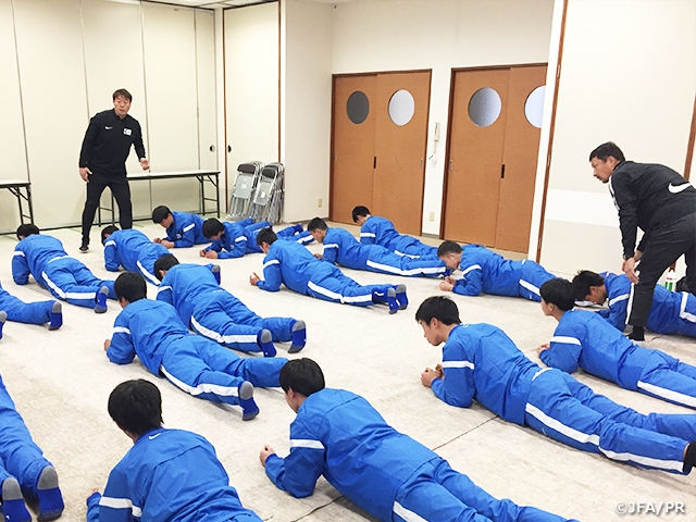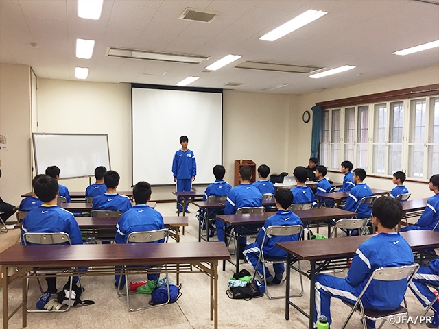 2018JFAエリートプログラムU-13のトレーニングキャンプが、12月12日(水)から静岡県裾野市の時之栖裾野スポーツセンターで始まりました。初日は小雨の中でのトレーニングでしたが、全国から集まった全22名の選手たちは疲れも見せず、元気にトレーニングに励みました。夜には濱崎芳己監督、川俣則幸GKコーチによる映像を交えたミーティングが実施され、選手たちは熱心に耳を傾けていました。16日(日)までの5日間で、トレーニングやトレーニングマッチ、ミーティングなど様々なプログラムを予定しています。