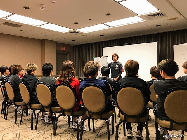 夜のミーティングでは映像を使ってアメリカを分析。攻守の特徴をチーム全体で共有し、戦い方のイメージを膨らませます。高倉麻子監督は、「明日も自分たちがやるべきことをやるだけ。けど、相手の特徴を見ながら変化をつけていくことが大事」と話し、「勝利のメンタリティを持つ女王に対して、一人でも弱気・迷いを見せたら負ける。決意を持って、女王相手に立ち向かう強い気持ちを全員が見せてほしい」という言葉でミーティングを締めました。