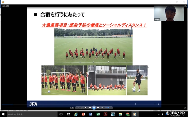 日本サッカー協会(JFA)は8月17日(月)、フィジカルフィットネスプロジェクト主催事業として、今年度2回目のJ1、J2、J3クラブのアカデミーのフィジカルコンディショニングスタッフ研修会をオンラインで開催しました。今回の研修会では、活動を再開したU-19、U-16日本代表チームについて、U-19日本代表フィジカルコーチの中馬健太郎さんとU-16日本代表コンディショニングコーチの小粥智浩さんより活動報告をした後、各クラブの再開後の状況や選手のコンディション状況について情報交換を行いました。
