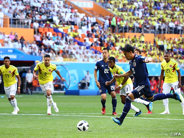 大事な初戦、スタンドには大勢のコロンビアサポーターがいて、さながらアウェイのようでした。しかし、試合開始早々に大迫勇也選手がシュート放ち、GKがはじいたボールに香川真司選手が反応。それを相手DFが腕でブロックし、日本はPKを獲得しました。このPKを香川選手が落ち着いて決めて先制に成功しました。開始からわずか3分のこと、まさに筋書きのないドラマです。チーム、関係者、サポーター、みんなの熱意が一つになったときにこういうことが起こるものなんですね。