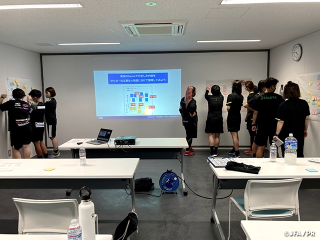 初日、緊張した様子で研修室に集まった受講者は、感染予防もあり静かに用件だけを口にし、名前がある座席に座り教本や資料を前にスタートを待っていました。ガイダンスが始まり、JFA指導者養成の全体像やJFAの取り組み、学習目標などが次第に見えてくることで、期待や不安が受講者の表情に現れてきました。実技やグループワークが始まって話し出すと緊張もほぐれ、質問や行動が活発になりました。カリキュラムが進むにつれて指導者の仕事を学び、コーチに必要な知識や理論を吸収し実技とリンクしながら内容を整理しているようでした。実技になるとサッカー経験の違いはあっても積極的でミスを恐れないプレーとそれを支える仲間になっていました。また、指導実践に向けて準備をする上で、分析・プランニングの観点からグループで積極的な意見交換が常になされていました。特に今回は、レベルアップも目的にしていることから指導実践の回数も増やし、ふたば未来学園高校女子サッカー部、磐城桜が丘高校女子サッカー部の選手に選手役をお願いし、指導実践を行いました。受講者は、指導実践を行うごとにその責任から、グループで集まり、それぞれの振り返りをもとにディスカッションし、オーガナイズやコーチングを改善しようとする姿が次第に多くなり、見違えるようにスキルアップしたと感じています。