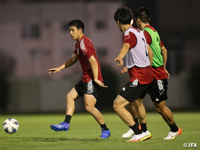 トレーニングの冒頭は全員でストレッチ、ジョギングから軽くステップを繰り返すウォームアップを行い、ここでこの日の昼に合流したばかりの長友佑都選手、酒井宏樹選手、大迫勇也選手、板倉滉選手、権田修一選手、谷晃生選手ら6選手は早めに切り上げ、コンディションを整えます。その後、ピッチに残った選手たちでボール回し、パス&コントロールを行い、サウジアラビアの空気を肌で感じながら汗を流します。そして最後にポゼッショントレーニングを行い、この日のトレーニングを締めくくりました。