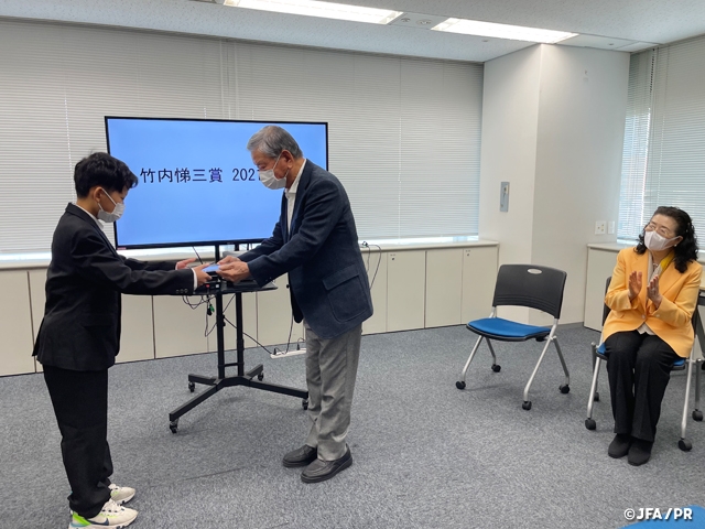 「第6回竹内悌三賞2021」(竹内悌三賞実行委員会主催、JFA後援)の表彰式が11月20日(土)、JFAハウスで行われました。本賞は、1936年のベルリンオリンピックサッカー日本代表のキャプテンで日本サッカー殿堂に掲額されている竹内悌三氏の長女である照明デザイナーの石井幹子さんがサッカーに励むひとり親家庭の小学生を応援しようと2015年に創設した賞で、全国から応募がありました。