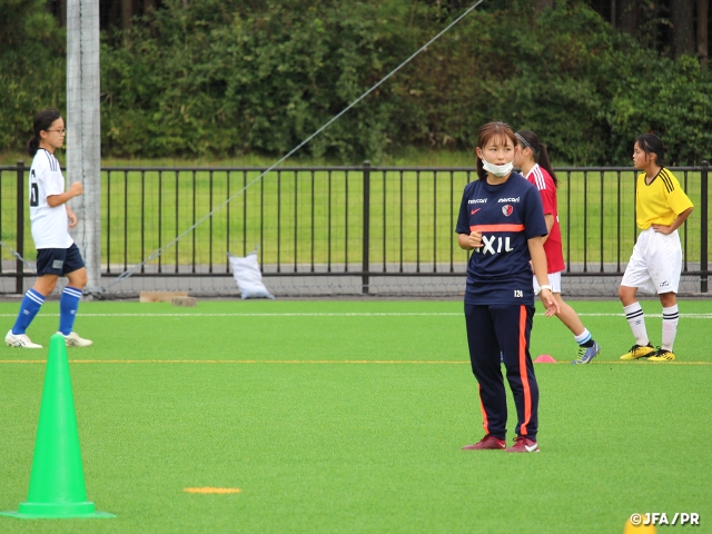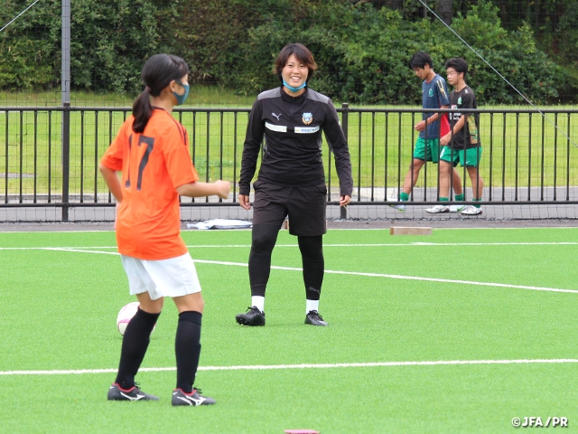 研修の中で、指導者の発する言葉や醸し出す雰囲気で、選手のモチベーションやパフォーマンスは大きく変化することを改めて認識しました。指導者のポジティブな言葉がけに選手は素直に反応していて、笑いながら楽しそうにプレーをしていました。短い時間の中で、選手同士や選手と指導者が打ち解けて、双方が楽しいと思える時間にするためには、指導者のパーソナリティや選手との接し方、雰囲気づくりがとても大切だと思いました。“女性同士“だから感じ合えることもあると思います。みんなが笑顔で溢れ、サッカーを存分に楽しめる場をこれからもつくっていきたいです。