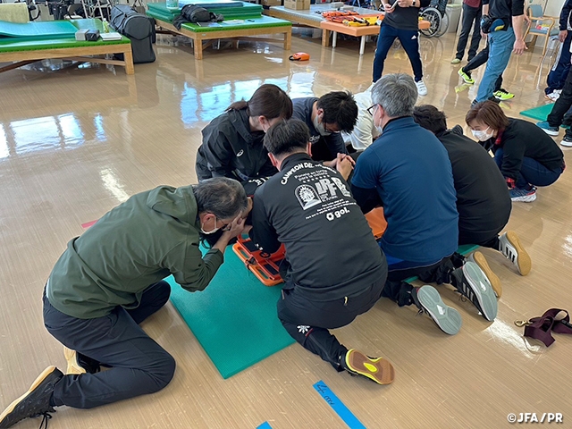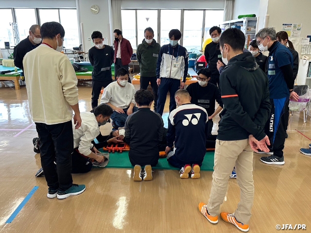 日本サッカー協会は、ピッチ上の選手の安全を守ることを第一とした「スポーツ救命ライセンス講習会」と簡易救命講習会である「JFA+PUSHコース」を2017年から実施しています。「スポーツ救命ライセンス講習会」は、(公財)日本スポーツ協会(JSPO)公認アスレティックトレーナーが資格更新のために保有しなければならないBLS(Basic Life Support:一次救命処置)資格取得のための講習会として認定されています。
