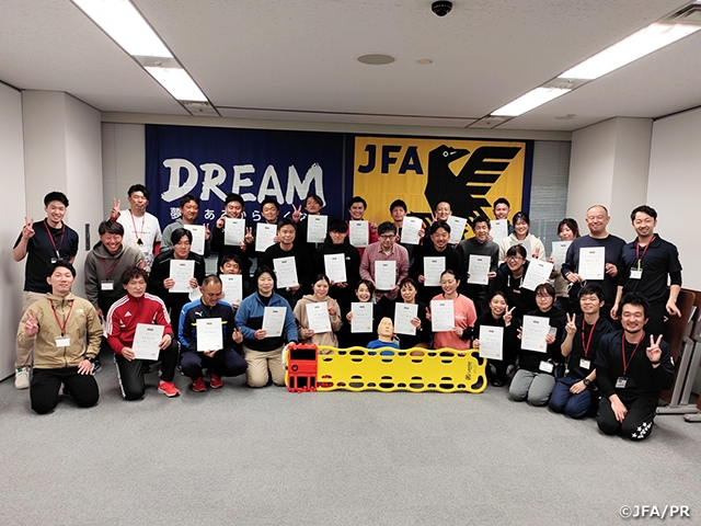 (一社)日本アスリートライフサポート協会(JALSA)は2月25日(土)、JFAハウスで新規取得者向けの「スポーツ救命ライセンス講習会」を開催しました。全国各地から29名が参加し、全員が筆記テストと実技テストに合格してライセンスを取得しました。