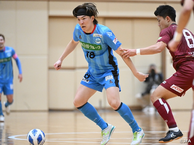 第2試合のフウガドールすみだ(F1/東京)とエスポラーダ北海道(F1/北海道)の一戦は、昨シーズンまでスペイン1部リーグで活躍していたすみだの清水和也選手が違いを見せました。第1ピリオド7分に右サイドからシュート性のボールで畠山勇気選手の先制点をアシストすると、第2ピリオド2分には高い位置で室田祐希選手からボールを奪い、GK関口優志選手をかわして鋭いシュートをゴールに決めました。