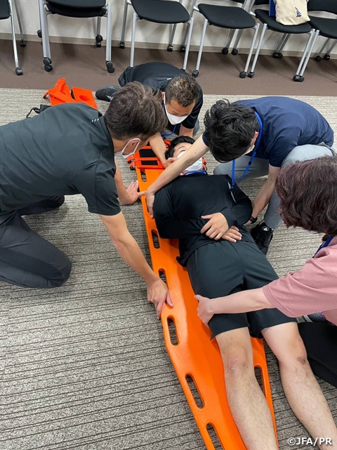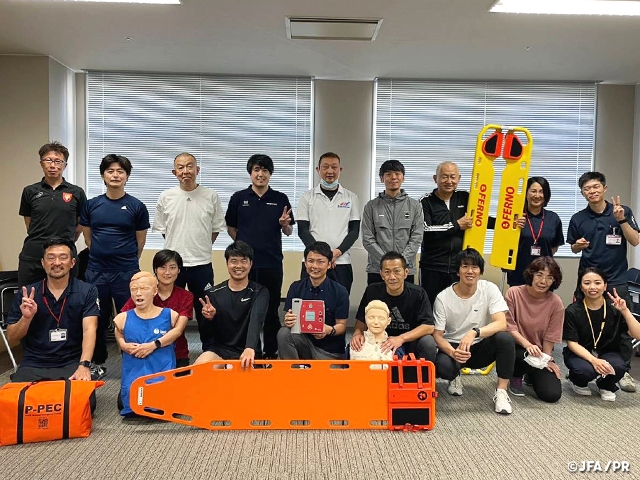 日本サッカー協会は、ピッチ上の選手の安全を守ることを第一とした「スポーツ救命ライセンス講習会」と簡易救命講習会である「JFA+PUSHコース」を2017年から実施しています。「スポーツ救命ライセンス講習会」は、(公財)日本スポーツ協会(JSPO)公認アスレティックトレーナーが資格更新のために保有しなければならないBLS(Basic Life Support:一次救命処置)資格取得のための講習会として認定されています。