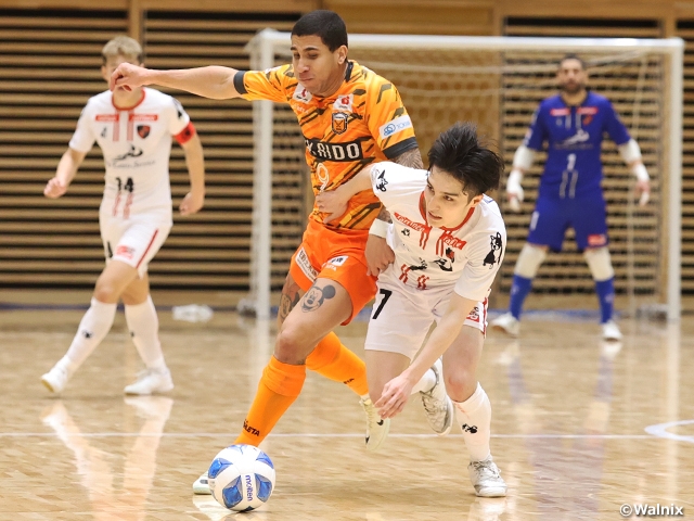 第2試合では、バサジィ大分(F1リーグ/大分)とバルドラール浦安(F1リーグ/千葉)が対戦しました。大分GK上原拓也選手、浦安GKピレス イゴール選手と両チームのGKが好セーブを連発したこともあり、第1ピリオドはスコアレスで終わります。第2ピリオドでは浦安が先手を取ります。第2ピリオド3分、左サイドを突破した長坂拓海選手がゴールネットを揺らし、浦安が試合を動かしました。大分も同9分に仁部屋和弘選手のロングボールから今季での引退を宣言している小門勇太選手がヘディングで同点ゴールを決めました。両チーム1点ずつを加えた終盤には、大島旺洋選手がGK上原選手との1対1のチャンスを逃さずに決勝ゴールを挙げ、浦安が3-2で勝利しました。