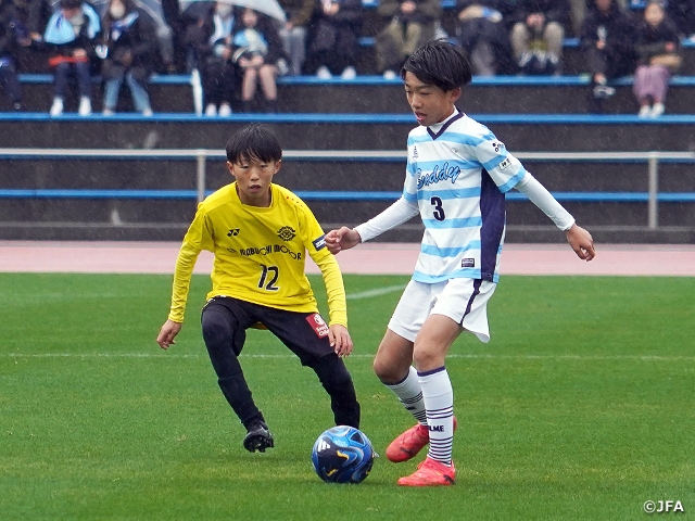 東京ヴェルディジュニア(東京)は、初出場で準々決勝に勝ち上がってきたFCゼロ(大阪)と対戦。長短のパスを駆使して攻撃を組み立てる東京Vに対し、ゼロはロングボールで相手ゴールに迫ります。両チームともに技術が高く、拮抗した展開となり、この試合もスコアが動いたのは終盤になってからでした。36分、味方のスルーパスに反応して相手ディフェンスラインの裏に抜け出た槇原昇希選手が決めて東京Vが均衡を破ると、その3分後に山本崇翔選手が追加点。終盤の2得点で東京Vが競り勝ちました。