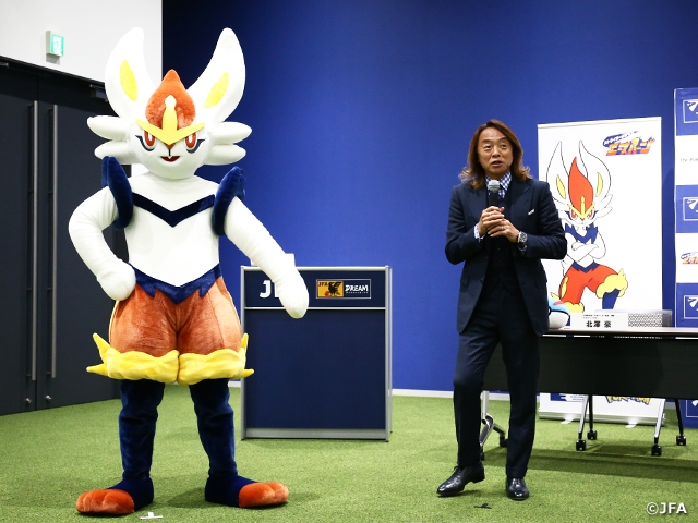 両代表の挨拶に続き、JFAキッズアンバサダーに就任したストライカーポケモン「エースバーン」の紹介映像が初公開されました。映像内では華麗な足さばきでディフェンスを次々と抜き去り、最後はリフティングからの必殺技「かえんボール」でシュートを決めるエースバーンの姿が映し出されました。これを見た北澤JYDアンバサダーは「プレーを見る限り、これは憧れるでしょう。すごいプレーでしたね」と絶賛すると共に、「子どもたちがサッカーに触れるきっかけになってほしい」とJFAキッズアンバサダーの今後の活躍への期待感を示しました。