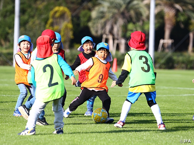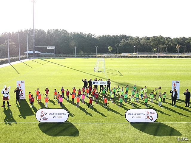 オンライン会見後には、高円宮記念JFA夢フィールドのメインピッチで「JFAキッズプログラム 巡回指導」が行われました。近隣の2つの保育園の園児たち約50名が参加、北澤JYDアンバサダーもスーツからジャージに着替えてコーチとして加わりました。
