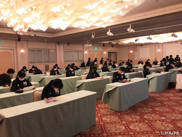 全国9地域から選ばれた32名の選手と、今回関わるスタッフは集合後、SmartAmp法検査を受け、全員の陰性を確認し、活動を開始しました。初日午後、ピッチに立った選手たちはまずフィジカルテストを行い、自分の基礎となる部分を把握することからスタート。その後は、なでしこジャパンの広瀬統一フィジカルコーチによる、フィジカルトレーニングを行いました。また、夜のミーティングではフィジカルテストの結果をフィードバックするとともに、広瀬コーチから継続して実施できるフィジカルトレーニングメニューなどを学びました。2日目は午前・午後、2グループに分かれてトレーニングを実施。感染予防対策をとりながらの活動となりましたが、32名の選手たちは、代表選手がトレーニングで使うピッチを踏みしめながら、積極的に取り組んでいました。また、夜のミーティングでは、同じくJFA夢フィールドで活動中のU-19日本代表候補に帯同している内田篤人ロールモデルコーチが選手たちへ激励の言葉をかけてくれました。キャンプ最終日となる3日目は、午前にゲームを行い、3日間のキャンプを打ち上げました。
