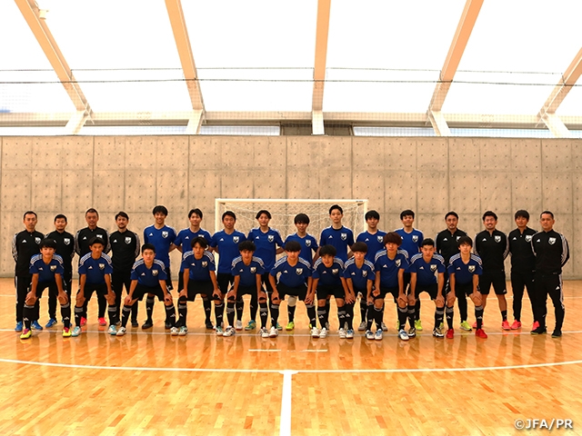 今年で2年目の開催を迎えるJFA U-18フットサルタレント育成普及事業の本年2回目を高円宮記念JFA夢フィールドにて12月2日、3日の2日間で開催しました。本活動は将来、フットサル日本代表でプレーする可能性を秘めた18歳以下の選手に参加してもらい、フットサル日本代表や年代別代表でプレーする選手のようなトップアスリートの基準(プレー強度やピッチ内外の習慣)の一部分に触れ、今後の選手生活に新しい習慣のヒントを見つけ、所属チームに戻ってからも更に研鑽してもらうことを目標にしています。活動に際し、今年8月に開催された全日本U-18フットサル選手権の本戦及び各地区大会の事前視察を行い、全国から総勢19名の選手が招集されました。1回目はU-16年代の選手が招集されたのに対して、今回はU-18世代の選手たちが多く招集されました。スタッフには本プロジェクトのリーダーを務めるフットサル日本代表及びU-20フットサル日本代表のナショナルコーチングスタッフである高橋健介コーチを筆頭に、フットサル委員会傘下のJFAフットサルインストラクターである鈴村拓也コーチ、豊島明コーチ、GKコーチにはJFAフットサルGKプロジェクトの三浦拓コーチ、そしてフィジカルコーチにはJFAフットサルフィジカルフィットネスプロジェクトより大室龍大コーチが参加しました。