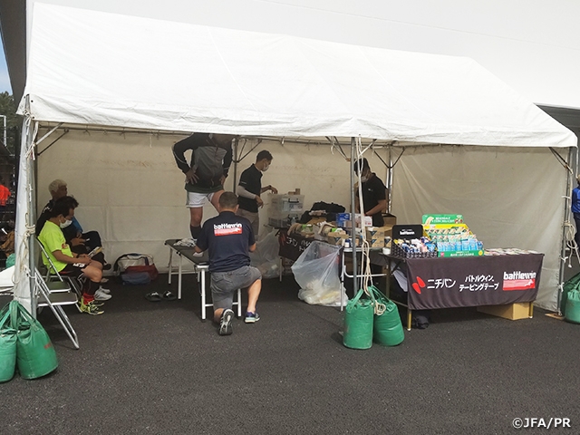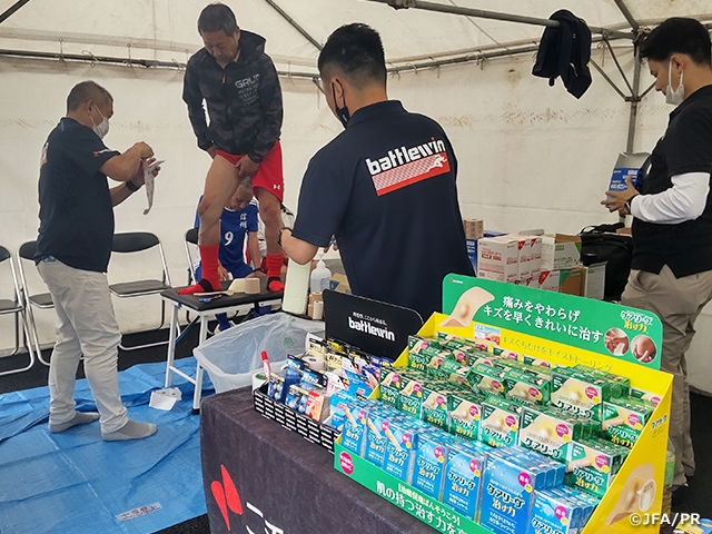 ブースでは、多くのサッカー大会に帯同経験のあるトレーナーが個々の症状をその場でヒアリングしながら的確に処置を行ったほか、同社のスタッフが普段のトレーニングに取り入れられるセルフケア方法を商品を使ってレクチャーし、テーピングの巻き方や巻く際のポイントを説明するなど、選手たちはサッカーをできるだけ長く楽しむために大切なメディカル知識を意欲的に学んでいました。