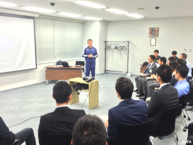 JFL主審の皆さんに、「レフェリーのフィジカルの重要性と取り組み」というテーマで、①トレーニングの目的について、②以前行っていたトレーニングと現在行っているトレーニングの違いと効果について、③現在行っているトレーニングについて、お話をさせて頂きました。