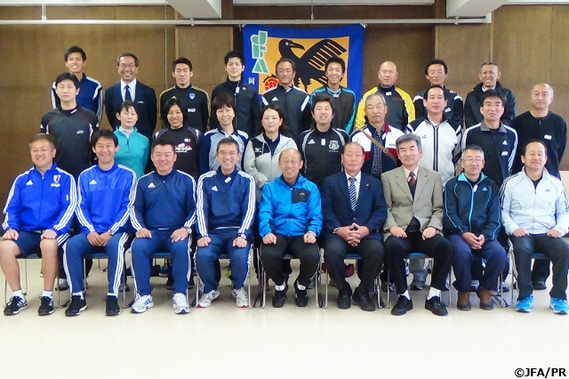 4月18日・19日に岡山県で第1回JFAレフェリーキャラバンを実施しました。これは、JFA審判委員やJFA審判インストラクターが、JFAと47都道府県サッカー協会(47FA)審判委員会と同じ方向性をもって継続的に審判員と審判インストラクターのレベルアップを目的とした活動です。2015年から2018年に47FAを2日間訪問して審判活動を協働で行い、47FAの審判の課題や今後の方向性などを情報交換します。2016年3月までの1年間で13の都道府県サッカー協会での開催を予定しています。