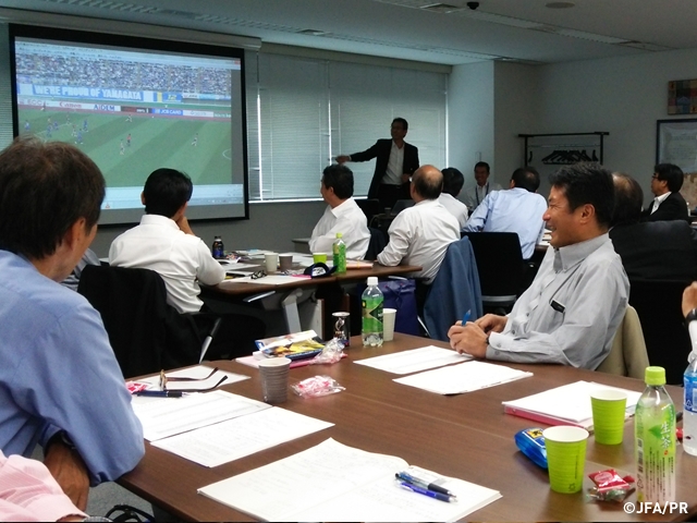 今シーズン前半のJリーグの映像を用い、ペナルティエリア内で起こった事象を中心に上川審判委員長より解説し、情報を共有しました。その事象の判定、判断理由、改善が必要な事象にはその具体的なアドバイスなどについて、映像を見ながらディスカッションしました。さらに、それをアセスメント(評価)にどのように反映するかも意見交換しました。