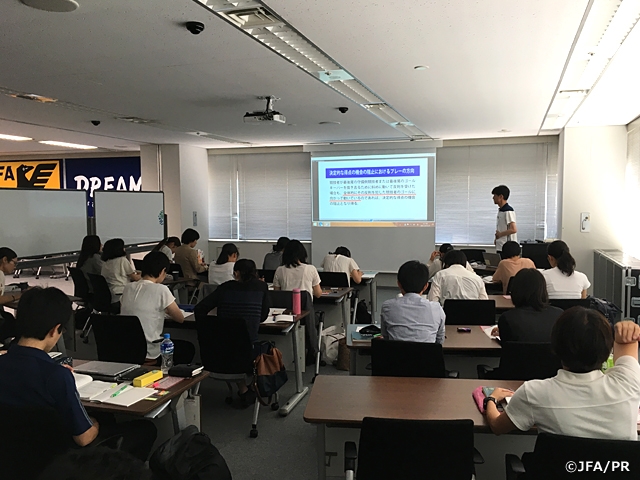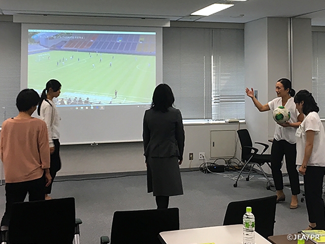 7月15日(土)、16日(日)、JFAハウスにて女子1級審判員を対象とした研修会を開催しました。目的は、競技規則改正の確認と、ここまでの振返りおよび今後に向けてです。両日とも活発な意見交換が行われました。なでしこリーグカップは佳境を迎え、全国大会も目白押しです。今後、女子1級審判員の更なる活躍が期待されるところです。