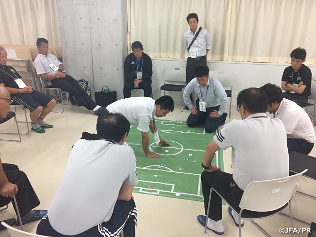 審判インストラクターは1日目に「チュータリング」の紹介と、翌日午後の実践に向けた準備を行いました。準備を終えたあとは翌日午前の「プラクティカルトレーニング」のプランをグループ毎にディスカッションし、指導の方向性を定めました。審判員は1日目にプロフェッショナルレフェリーの講義と、国際サッカー連盟(FIFA)から提供されている教材(ティーチングマテリアル)を使用した判定基準の確認を行いました。2日目は奈良県の審判インストラクターが前日の準備を基に、新しい指導方法を試みる機会として、プラクティカルトレーニング、チュータリングを実践しました。