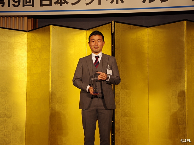 この度は、このような栄えある賞をいただき大変光栄に思います。日本フットボールリーグ関係者の皆様、チームの皆様、いつもサポートいただいているJFAの皆様、そして苦楽を共にし、一年間を通して切磋琢磨した審判員の仲間に心より感謝いたします。また、サッカーをできる身体に育ててくれた両親、そして審判活動を理解しいつも送り出してくれる家族に、この場を借りて感謝の気持ちを伝えたいと思います。これからも伝統あるJFLが更なる魅力的なリーグになるよう祈念しています。この度は本当にありがとうございました。