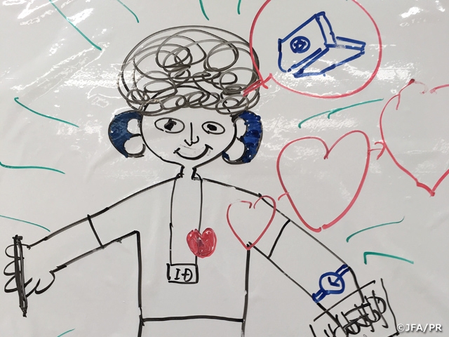 当日は、宮崎県サッカー協会所属のサッカー、フットサルのインストラクター計14名が参加しました。冒頭で、宮崎県サッカー協会の橋田和実会長から参加者に向けて、日ごろの活動への感謝とともに審判員養成の重要性についてご挨拶がありました。その後、チュータリングの理論と実践に臨みました。ファウルがあり主審が笛を吹いた直後から、再開の合図までに主審がやるべきことを「6ステップ」の手法を用いて6段階に整理したり、理想の審判インストラクター像を絵で示す「ドローイング」の手法によりユニークな絵を作成したりと、各インストラクターは新しい手法の習得に熱心に励んでいました。