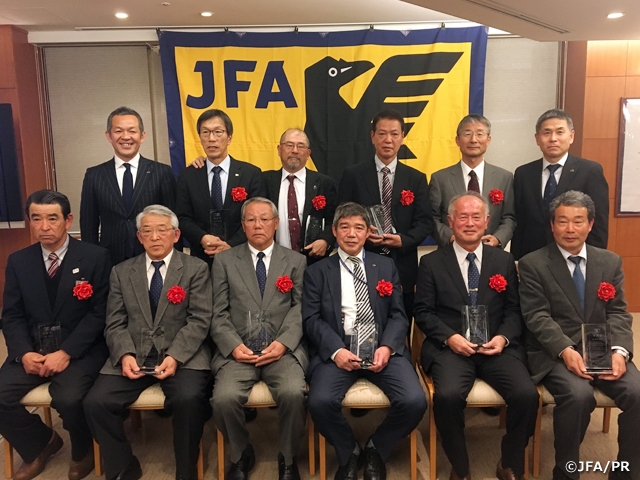初日は小川佳実JFA審判委員長の挨拶から始まり、新シーズンに向けたレフェリングに関するスタンダードやハンドリングに関する説明がなされました。研修会終了後には、2018年シーズンで勇退する12名の審判インストラクターの方々の表彰式が行われました。