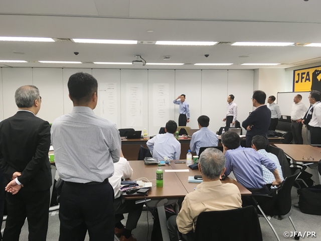 日本サッカー協会は、2019年度1級審判インストラクター研修会を4月6日(土)と7日(日)の両日、JFAハウスで開催しました。この研修会は、審判員の評価を行うアセッサー担当以外の1級審判インストラクターを対象に行われ、39名が参加しました。
